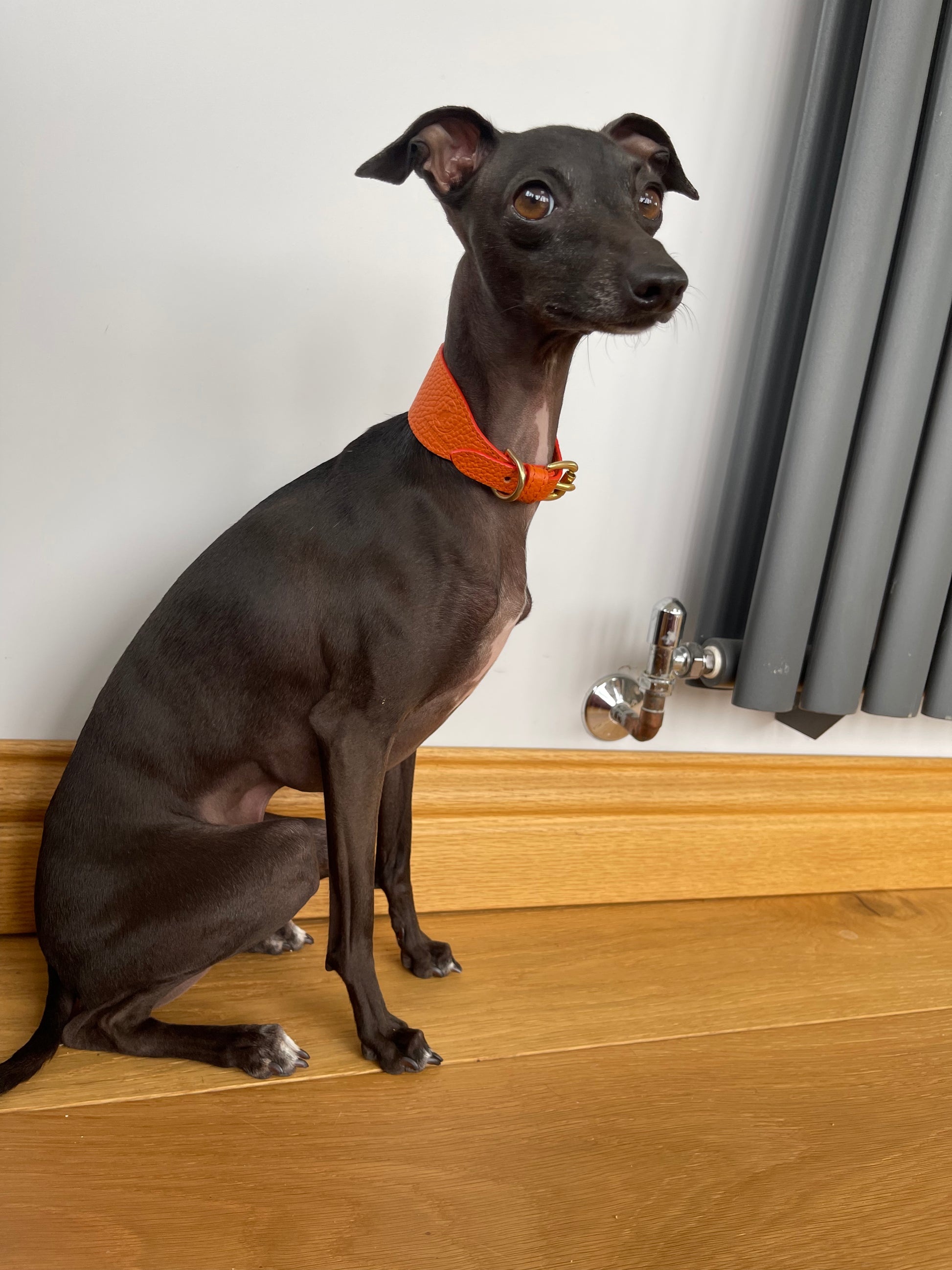 Made in the UK using the softest Italian Dollaro embossed leather handpicked perfectly just for your Italian Greyhound. The leather is flexible yet durable being made double sided for a super smooth and caringly comfortable inside surface which sits perfectly against your delicate pooches neck.