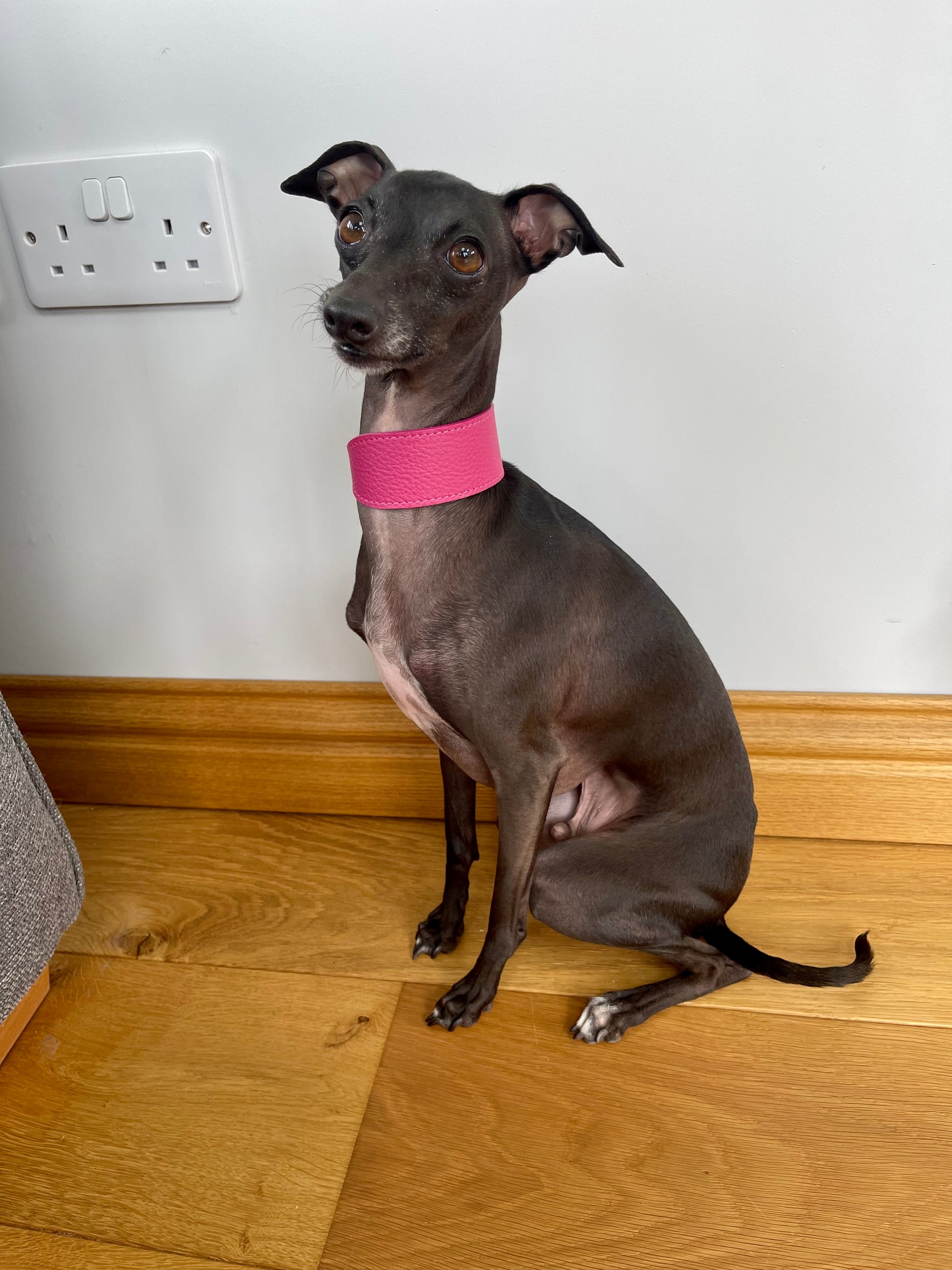 Made in the UK using the softest Italian Dollaro embossed leather handpicked perfectly just for your Italian Greyhound. The leather is flexible yet durable being made double sided for a super smooth and caringly comfortable inside surface which sits perfectly against your delicate pooches neck.